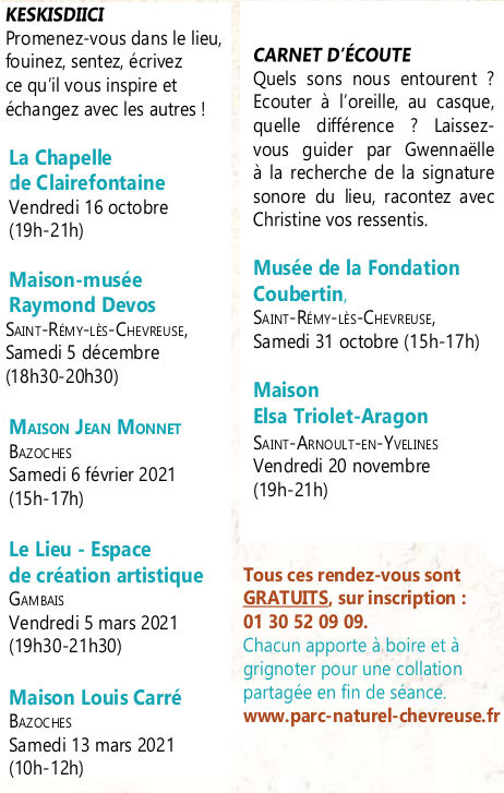 Suite au REconfinement, les ateliers sont actuellement suspendus. Nous espérons que l’agenda ci-dessous restera valide pour 2021 mais les prochaines rendez-vous sont annulés. Nous vous tiendrons informé·es. Également sur le site du PNR.